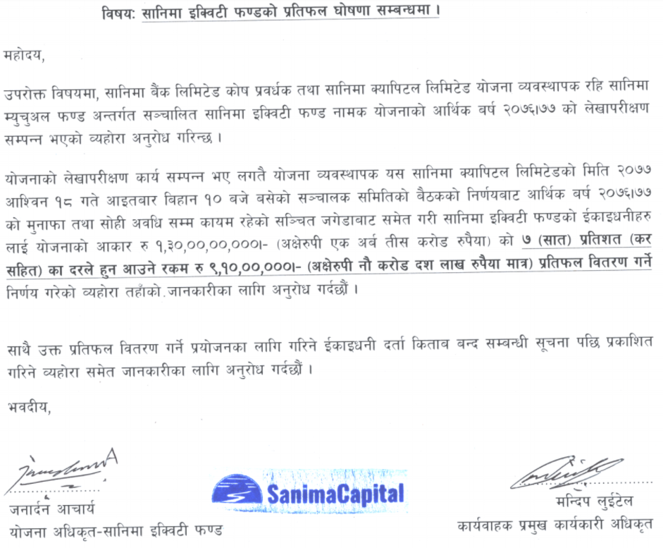 काठमाडौं । सानिमा इक्विटी फण्डले गत आर्थिक वर्षको मुनफाबाट लगानीकर्तालाई वितरण गर्ने प्रतिफल घोषणा गरेको छ ।