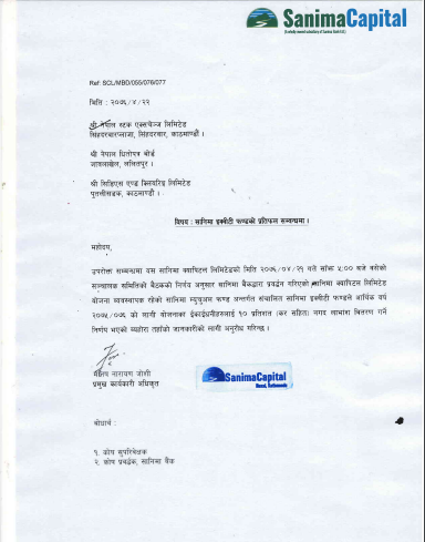 सानिमा बैंककै सिष्टर कम्पनी सानिमा क्यापिटले व्यवस्थापन गरेको सानिमा ईक्वीटी फण्डका इकाईधनीहरुलाई १० प्रतिशत कर सहित नगद लाभांश वितरण गर्ने भएको हो ।