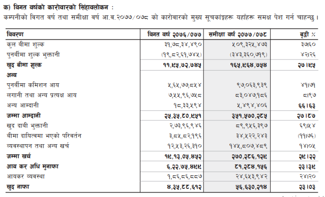 कम्पनीका अध्यक्षले प्रस्तुत गरेको प्रतिवेदन अनुसार कम्नपीले गत आर्थिक वर्षमा कुल बीमा शुल्क आर्जन ३७.६० प्रतिशतले बृद्धि भएको छ । कम्पनीले ५० करोड ९३ लाख रुपैयाँ कुल बीमा शुल्क आर्जन गर्न सफल भएको छ भने पुनर्बीम शुल्क भुक्तानी पछि खुद बीमा शुल्क आर्जन भने १६ करोड ५९ लाख रुपैयाँ आर्जन गरेको छ ।