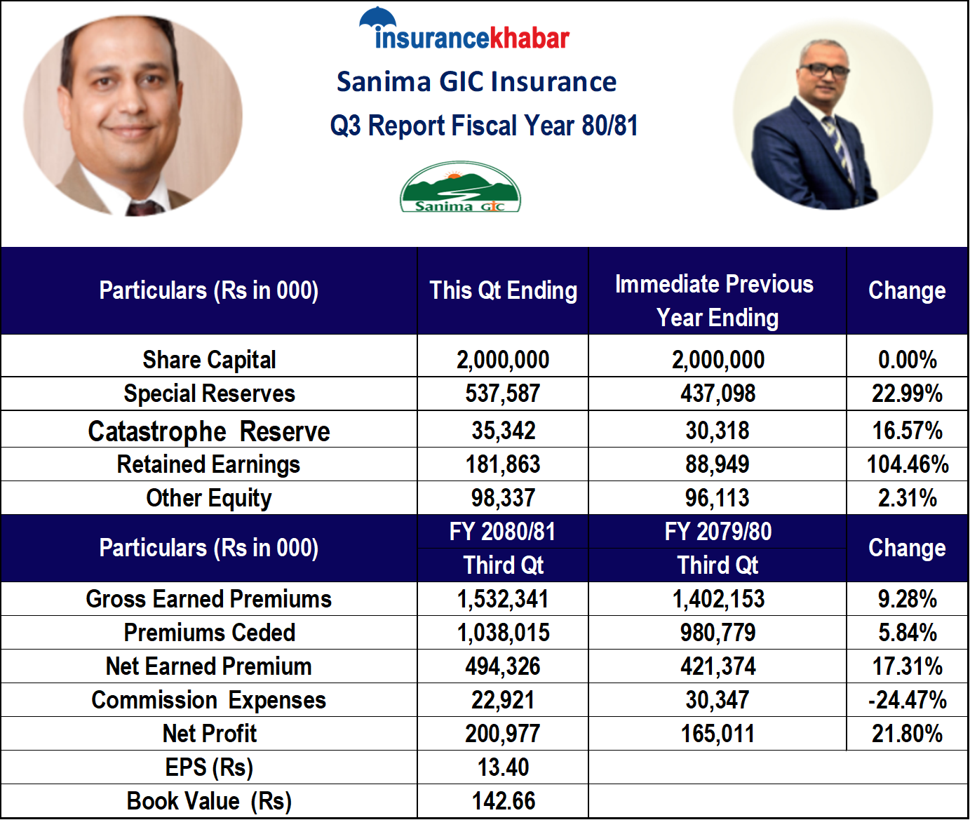 त्यस्तै कम्पनीले ४९ करोड ४३ लाख रुपैयाँ खुद बीमा शुल्क आर्जन गरेको छ । गत आर्थिक वर्षको तुलनामा खुद बीमा शुल्क आर्जन १७.३१ प्रतिशतले वृद्धि भएको हो ।