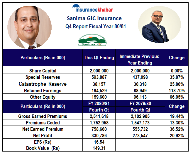 काठमाडौं । सानिमा जीआईसी इन्स्योरेन्सले आर्थिक वर्ष २०८०।८१ को चौथो त्रैमाससम्मको वित्तीय विवरण प्रकाशन गरेको छ।