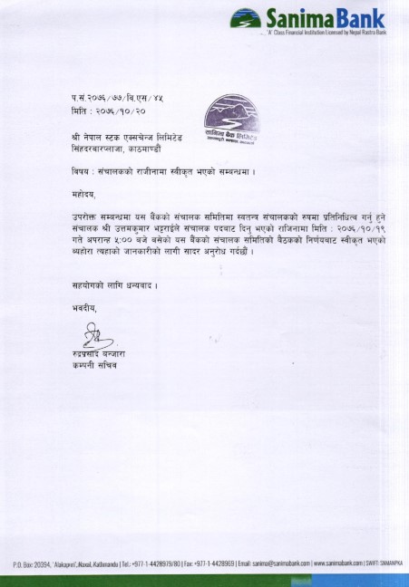 सानिमा बैंकका संचालकको राजिनामा स्वीकृत