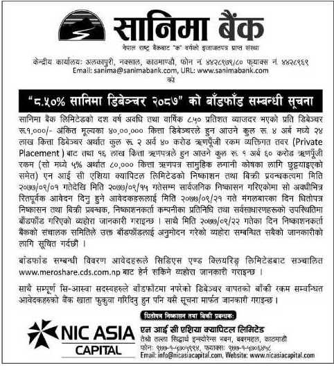 बैंकले १० वर्ष अवधिको लागि ‘१० दशमलव २५ प्रतिशत सानिमा बैंक डिबेन्चर २०८७’ नाममा ४ अर्ब रूपैयाँ बराबरको ४० लाख कित्ता ऋणपत्र निष्कासन तथा बिक्री खुला गरेको थियो । जसमध्ये बैंकले सर्वसाधारणका लागि १६ लाख कित्ता र व्यक्तिगत रुपमा विभिन्न संघ संस्थालाई २४ लाख कित्ता बिक्री गरेको थियो । यसैगरी, सर्वसाधारणका लागि निष्कासन गरिने कुल ऋणपत्रमध्ये ५ प्रतिशत अर्थात् ८० हजार कित्ता कित्ता ऋणपत्र सामूहिक लगानी कोषका लागि छुट्याइएको थियो ।