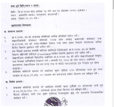 वार्षिक साधारणसभामा संचालक समितिले गरेको प्रस्ताव अनुसार १० प्रतिशत बोनस सेयर र चुक्तापूँजीको ३ दशमलव ६० प्रतिशत नगद लाभांश वितरणको विषय विशेष प्रस्तावको रुपमा प्रस्तुत गर्ने भएको छ ।उक्त सभाले २०७६र ७७ को संचालक समितिको वार्षिक प्रतिवेदन पारित गर्ने, चालु आर्थिक बर्षको असार मसान्तको वासलात तथा आ.ब. २०७६र७७ को नाफा नोक्सान हिसाब तथा नगद प्रवाह विवरण लगायतका वार्षिक वित्तीय विवरणहरु छलफल गरी पारित गर्ने भएको छ ।
