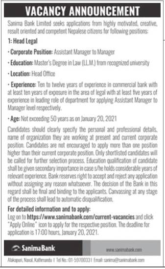 काठमाडौँ । सानिमा बैंक लिमिटेडले कर्मचारीको माग गरेको छ । बैंकले एक जना हेड लिगलका लागि कर्मचारीको माग गरेको छ । ईच्छुक तथा योग्यता पुगेका नेपाली नागरिकले माघ ७ गतेभित्र आवेदन दिन सक्नेछन् ।