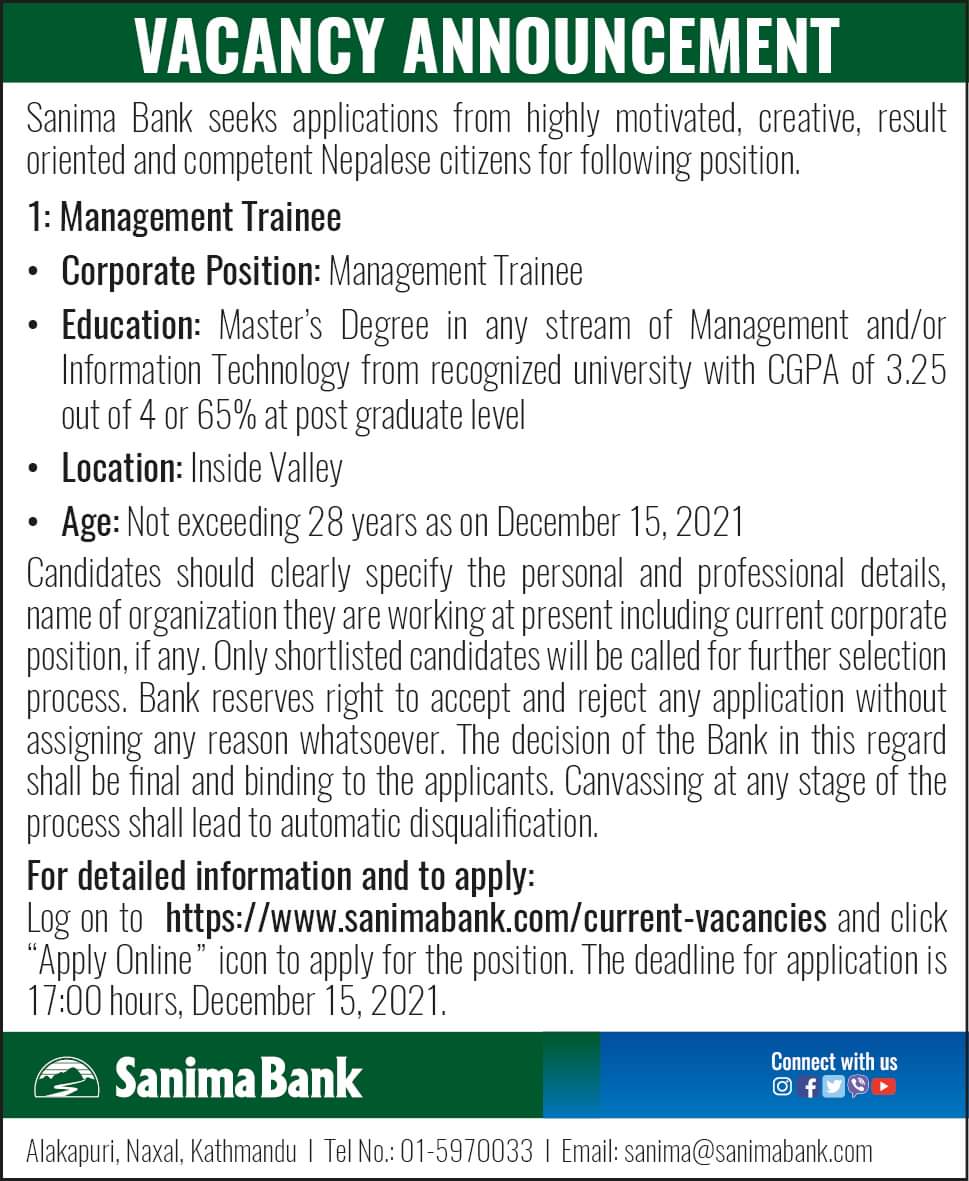 काठमाडौं । सानिमा बैंकले कर्मचारीको माग गरेको छ । बैंक म्यानेजमेन्ट ट्रेनीका लागि कर्मचारीको मगा गरेको छ । बैंकले काठमाडौं उपत्यकाका लागि कर्मचारीको माग गरेको हो ।