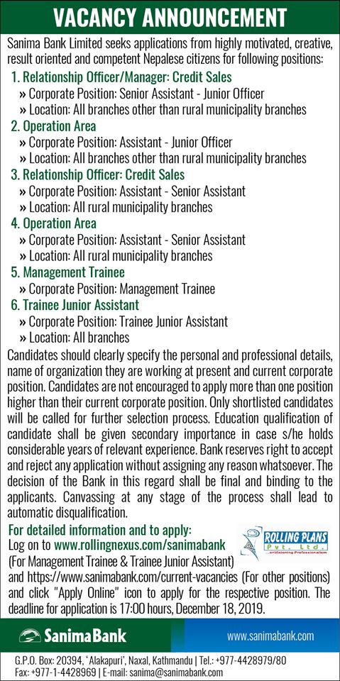 ईच्छुक तथा योग्यता पुगकाले डिसेम्बर १८ भित्र आवेदन दिइसक्नुपर्ने बैंकले जनाएको छ ।
