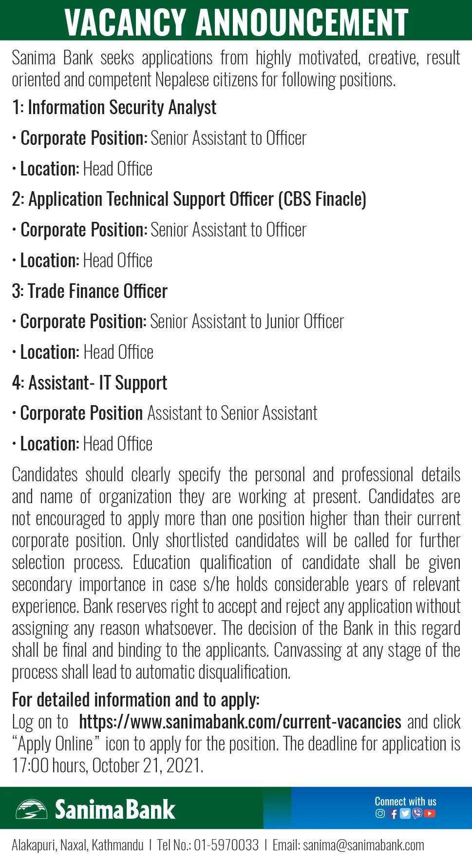 काठमाडौं । सानिमा बैंकले विभिन्न पदका लागि धेरै संख्यामा कर्मचारीको माग गरेको छ । बैंकले इन्फरमेसन सेक्युरिटि एनलाइटिकका लागि सिनियर असिस्टेन्टदेखि अफिसरसम्मका केही, टेक्निकल सर्पोट अफिसरका लागि सिनियर असिस्टेन्टदेखि अफिसरसम्मका केही, ट्रेड फाइनान्सका लागि सिनियर अफिसरदेखि जुनियर अफिसरका लागि केही, असिस्टेन्ट आइटी सर्पोटका लागि असिस्टेन्टदेखि सिनियर असिस्टेन्टसम्मका केही संख्यामा कर्मचारीको माग गरेको हो ।