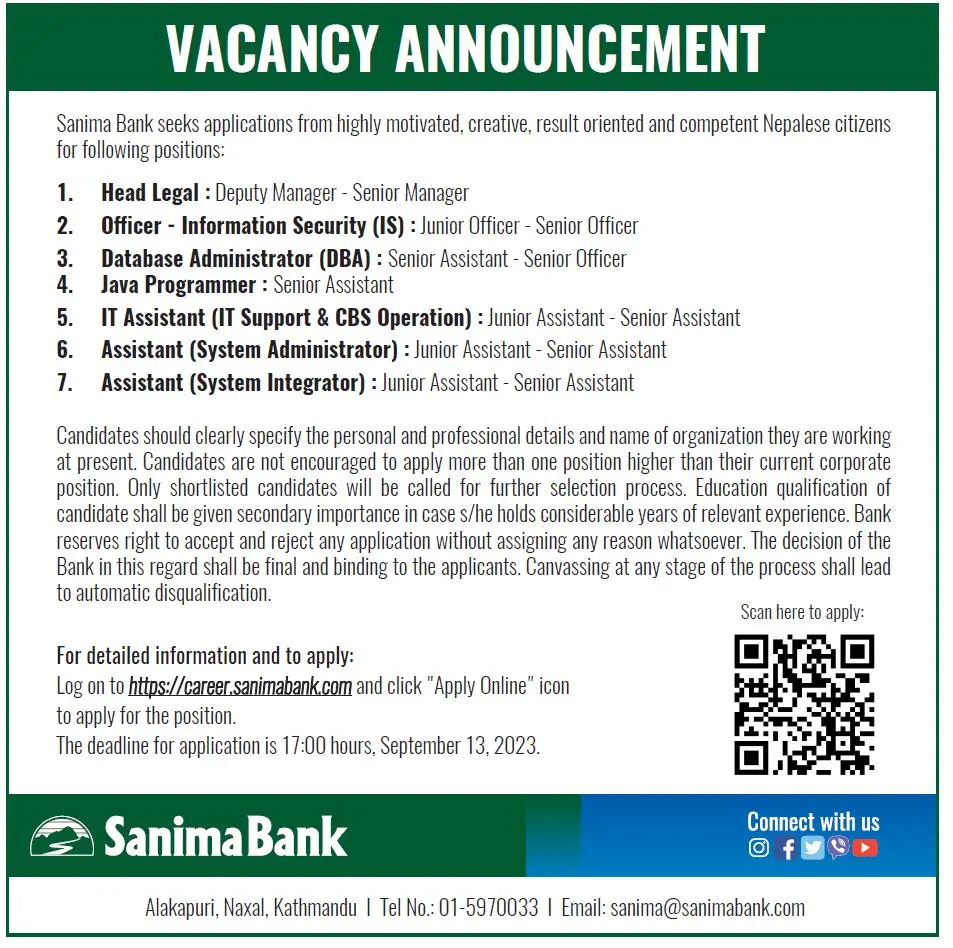 बैंकले हेड लेगलमा डेपुटी म्यानेजर, सिनियर म्यानेजर, आइएसमा जूनियर अफिसर र सिनियर अफिसरका लागि केही, डाटावेस एडमिनिष्ट्रेटरमा सिनियर असिस्टेन्ट र सिनियर अफिसरका लागि केही, जाभा प्रोग्रामरमा सिनियर अफिसरका लागि, आइटीमा जुनियर असिस्टेन्ट, सिनियर असिस्टेन्ट, लगायत ७ पदका लागि कर्मचारी माग गरेको हो ।