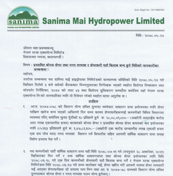 काठमाडौं । सानिमा माई हाइड्रोपावर लिमिटेडले आर्थिक वर्ष २०७७ /७८ को लागि लाभांश घोषणा गरेको छ । कम्पनीको हिजो बिहिबार सम्पन्न संचालक समितिको बैठकले आफ्ना शेयरधनीलाई कुल १० दशमलव ५२६३ लाभांश दिने प्रस्ताव गरेको हो ।