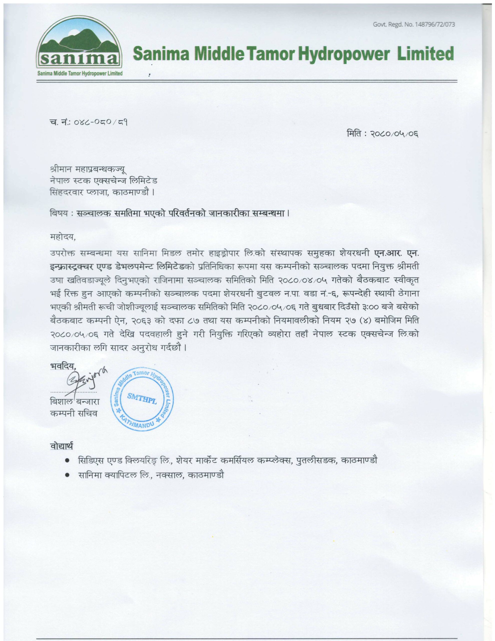 काठमाडौं । सानिमा मिडल तमोर हाइड्रोपावरको सञ्चालकमा रूची जोशी नियुक्त भएकी छिन् । कम्पनीको संस्थापक समूहका शेयरधनी एनआरएन इन्फ्रास्ट्रक्चर एण्ड डेभलपमेन्टको प्रतिनिधिका रुपमा कम्पनीको सञ्चालक पदमा रहदै आएकी सञ्चालक उषा खतिवडाले राजिनामा दिएकी थिइन् ।