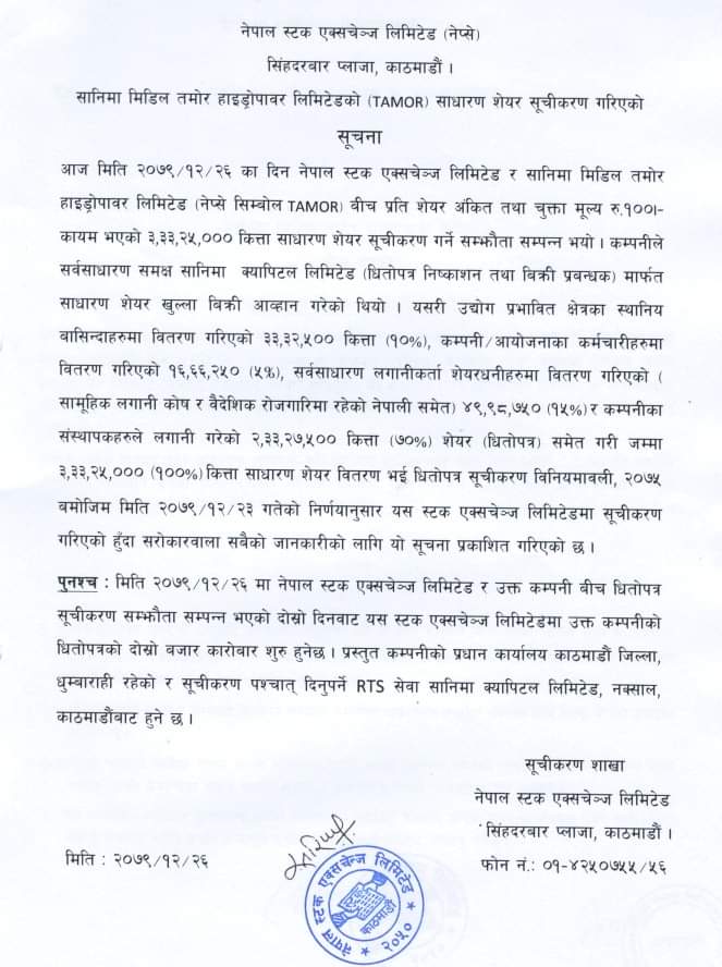 काठमाडौं । नेप्सेमा सानिमा मिडिल तमोर हाइड्रोपावर लिमिटेडको आइपीओ सूचिकृत भएको छ । कम्पनीको कुल ३ करोड ३३ लाख २५ हजार कित्ता साधारण शेयर सूचिकृत भएको हो । कम्पनीको स्टक सिम्बोल टिएएमओआर रहेको छ ।