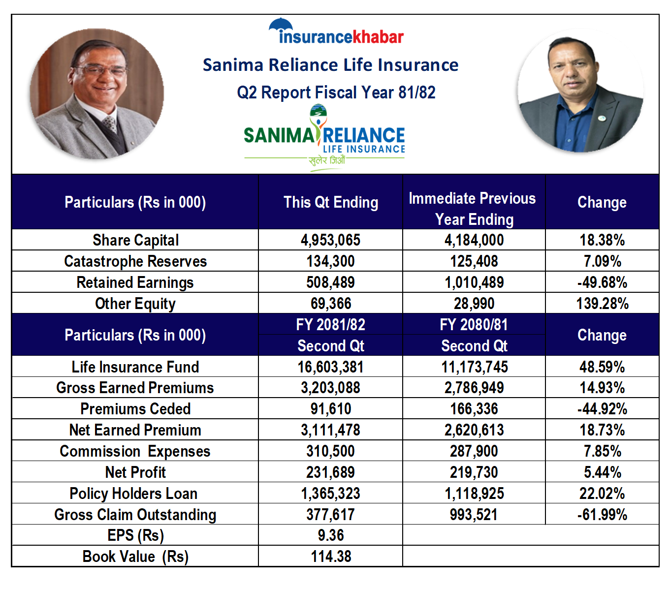 काठमाडौं । सानिमा रिलायन्स लाइफ इन्स्योरेन्सले चालु आर्थिक वर्षको दोस्रो त्रैमास (साउन–पुस)सम्मको अपरिष्कृत वित्तीय विवरण सार्वजनिक गरेको छ । कम्पनीले प्रकाशन गरेको वित्तीय विवरण अनुसार कम्पनीको अधिकांश सूचकमा आकर्षक बृद्धि भएको छ ।
