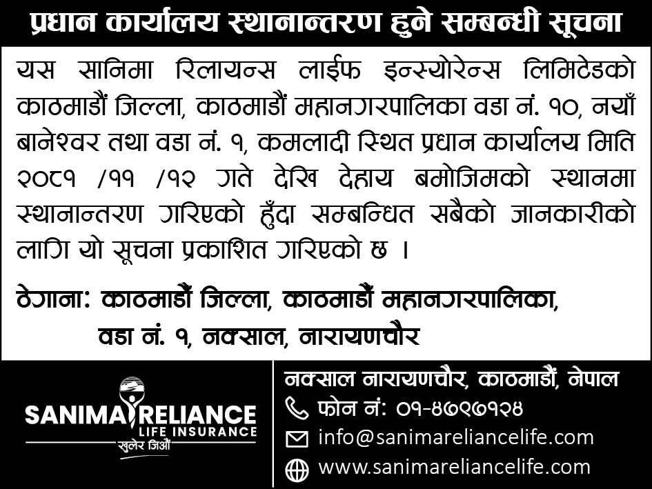 काठमाडौं । सानिमा रिलायन्स लाइफले आफ्नो प्रधान कार्यालय स्थानान्तरण गर्ने भएको छ । कम्पनीको प्रधान कार्यालय अब काठमाडौं जिल्ला काठमाडौं महानगरपालिका वडा नं. १ नक्साल नारायणचौरमा स्थानान्तरण हुने जनाइएको हो । यस अघि कम्पनीको प्रधान कार्यालय काठमाडौं जिल्ला काठमाडौं महानगरपालिका वडा नं. १० नयाँ बानेश्वर तथा वडा नं. १ कमलादीमा रहेको थियो ।