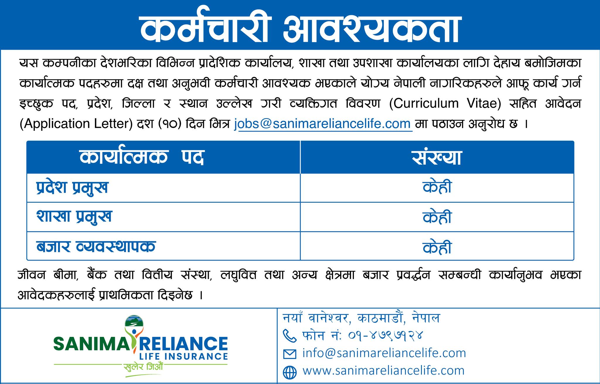 काठमाडौं । सानिमा रिलायन्स लाइफ इनस्योरेन्स लिमिटेडले कर्मचारी माग गरेको छ । कम्पनीले एक सूचना जारी गर्दै प्रदेश प्रमुखका लागि केही, शाखा प्रमुखका लागि केही र बजार व्यवस्थापकका लागि केही संख्यामा कर्मचारी माग गरेको जनाएको हो । ईच्छुक तथा योग्यता पुगेकाले आज सूचना प्रकाशित भएको मिति चैत २१ गतेले १० दिनभित्र कम्पनीको वेभसाइट मार्फत आवेदन दिनुपर्नेछ ।