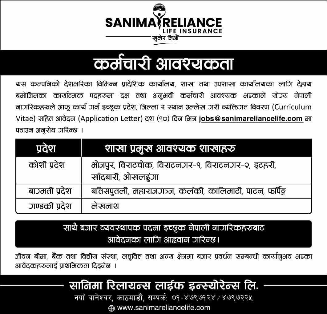 सानिमा रिलायन्स लाइफले माग्यो १४ शाखाका लागि ब्रान्च म्यानेजर