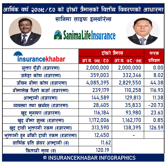 काठमाडौं । सानिमा लाइफ इन्स्योरेन्सले चालु आर्थिक वर्ष ७९/८० को दोश्रो त्रैमासको वित्तीय प्रतिवेदन सार्वजनिक गरेको छ । प्रकाशित तथ्यांक अनुसार कम्पनीले गत आर्थिक वर्षको दोश्रो त्रैमासको तुलनामा २३ दशमलव ६३ प्रतिशत धेरै खुद नाफा गर्न सफल भएको छ । कम्पनीले अहिले दोश्रो त्रैमाससम्म ११ करोड ६१ लाख खुद नाफा गर्दा गत आर्थिक वर्षको दोश्रो त्रैमाससम्म ९ करोड ३९ लाख खुद नाफा गरेको थियो ।