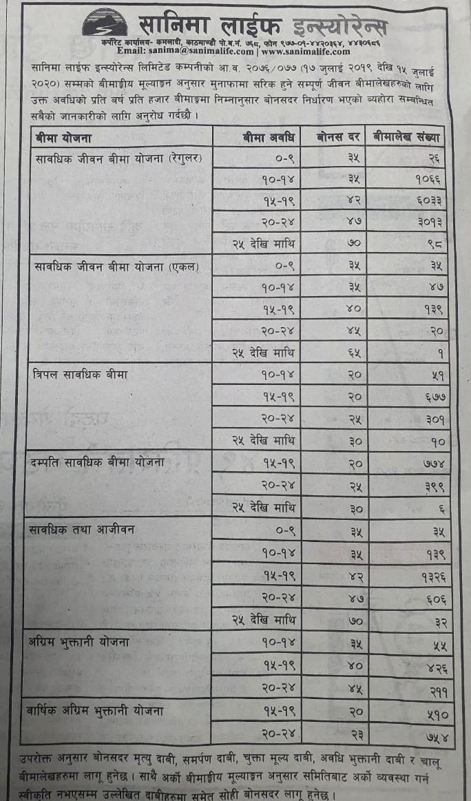 प्रस्तुत बोनसदर मृत्यु दाबी, समर्पण दाबी, चुक्ता मूल्य दाबी, अवधि भुक्तानी दाबी र चालू बीमालेखहरुमा लागु हुने कम्पनीले जनाएको छ । साथै अर्को बीमाङ्कीय मूल्याङ्कन अनुसार समितिबाट अर्को व्यवस्था गर्न स्वीकृति नभएसम्म उल्लेखित दाबीहरुमा समेत सोही बोनसदर लागु हुनेछ ।