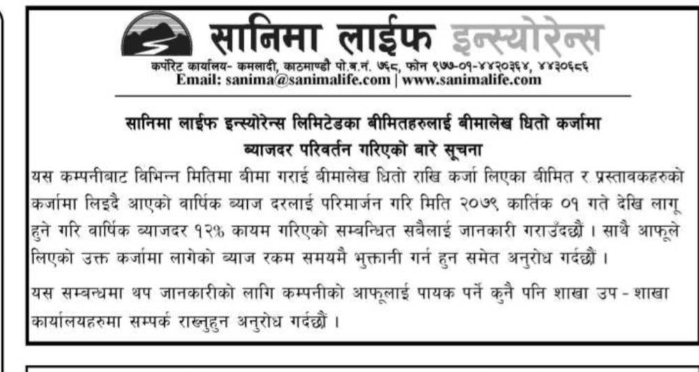 काठमाडौं । सानिमा लाइफ इन्स्योरेन्स कम्पनीले बीमितहरुलाई दिँदै आएको बीमालेख धितो कर्जाको व्याजदर परिवर्तन भएको छ । कम्पनीले एक सुचना जारी गर्दै कम्पनीबाट विभिन्न मितिमा बीमा गराई बीमालेख धितो राखी कर्जा लिएका बीमित र प्रस्तावकहरुको कर्जामा लिइदै आएको व्याजदर परिमार्जन गरी १२ प्रतिशत कायम गरेको बताएको छ ।