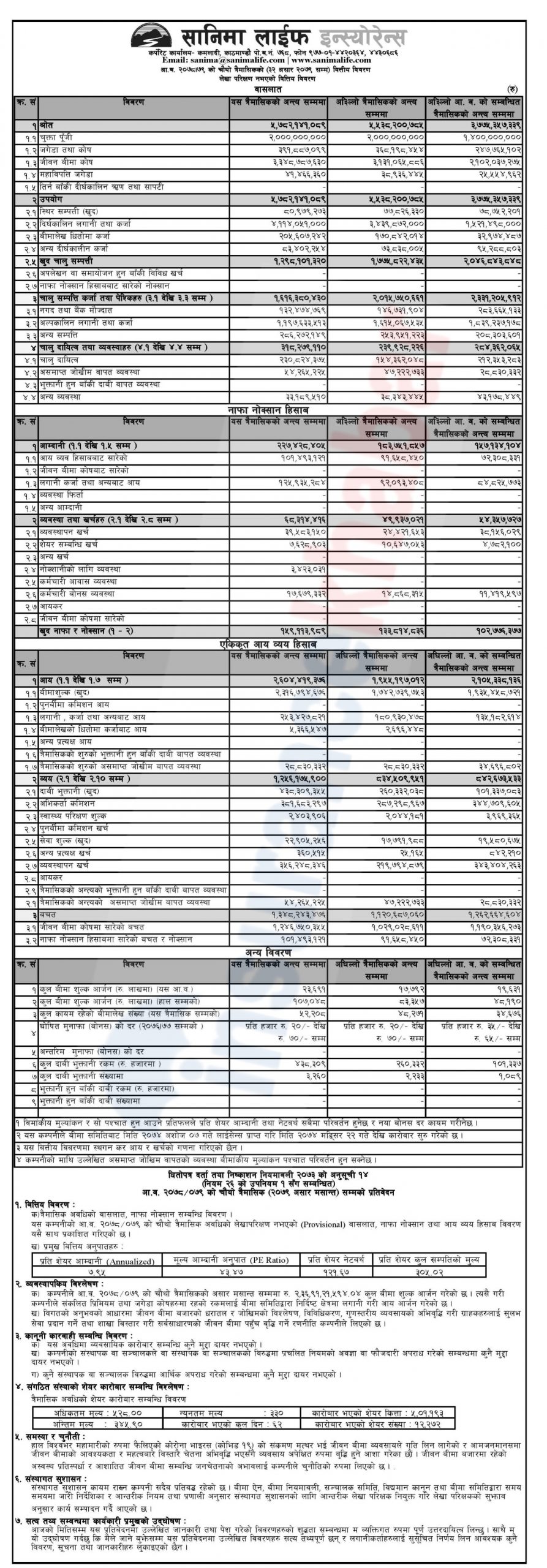 सानिमा लाइफको बीमाशुल्क २० प्रतिशतले वृद्धि, करिव १६ करोड नाफा (रिपोर्ट सहित)