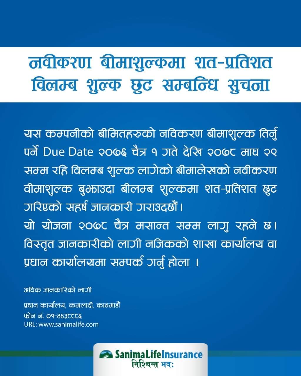 यस योजना २०७८ चैत मसान्तसम्म मात्र लागु हुने कम्पनीले जनाएको छ । जसका लागि कम्पनीले कम्पनीको कर्पोरेट तथा प्रदेशस्थित शाखा कार्यालय, तथा उपशाखा कार्यालयहरुबाट र अभिकर्तासँग सम्र्पक गर्न आग्रह गरेको छ ।