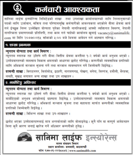 काठमाडौं । सानिमा लाइफले शाखा तथा उपशाखाका लागि कर्मचारी माग गरेको छ । कम्पनीले शाखा प्रबन्धक र मार्केटिङ अफिसर पदका लागि कर्मचारी माग गरेको हो ।