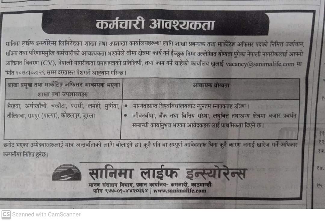 सानिमा लाइफले माग्यो ठुलो संख्यामा कर्मचारी, दरखास्त दिने आज अन्तिम दिन