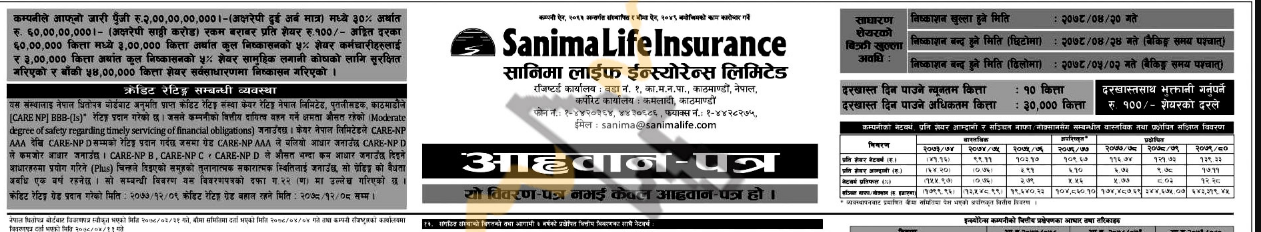 काठमाडौं । सानिमा लाइफ इन्स्योरेन्स कम्पनीले साउन २० गतेबाट प्राथमिक शेयर (आइपीओ) निष्काशन तथा विक्री खुला गर्ने भएको छ । कम्पनीले एक सय रुपैयाँ अंकति दरमा ६० करोड रुपैयाँ बराबरको ६० लाख कित्ता आइपीओ निष्काशन तथा विक्री गर्न लागेको हो । जसमध्ये कम्पनीले ३ लाख कित्ता अर्थात ५ प्रतिशत कर्मचारी र३ लाख कित्ता अर्थात ५ प्रतिशत नै सामुहकि लगानी कोषका लागि सुरक्षित गरिएको छ । र बाँकि ५४ लाख कित्ता सर्वसाधरणका लागि छुटाइएको छ ।