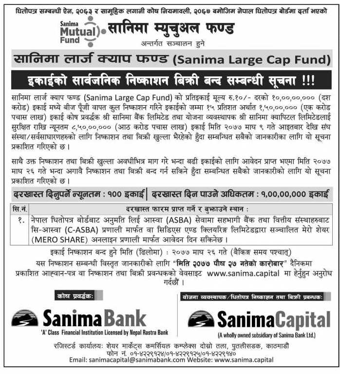 काठमाडौं । सानिमा क्यापिटल लिमिटेडले माघ ९ गतेदेखि निष्काशन तथा बिक्री खुला गरेको सानिमा लार्ज क्याप फन्ड नामक सामुहिक लगानी कोषमा आवेदन दिने समय थप भएको छ । यसअघि माघ १३ गतेसम्म दिन पाइने भनिएकोमा अब माघ २६ गतेसम्म आवेदन दिन पाइनेछ ।