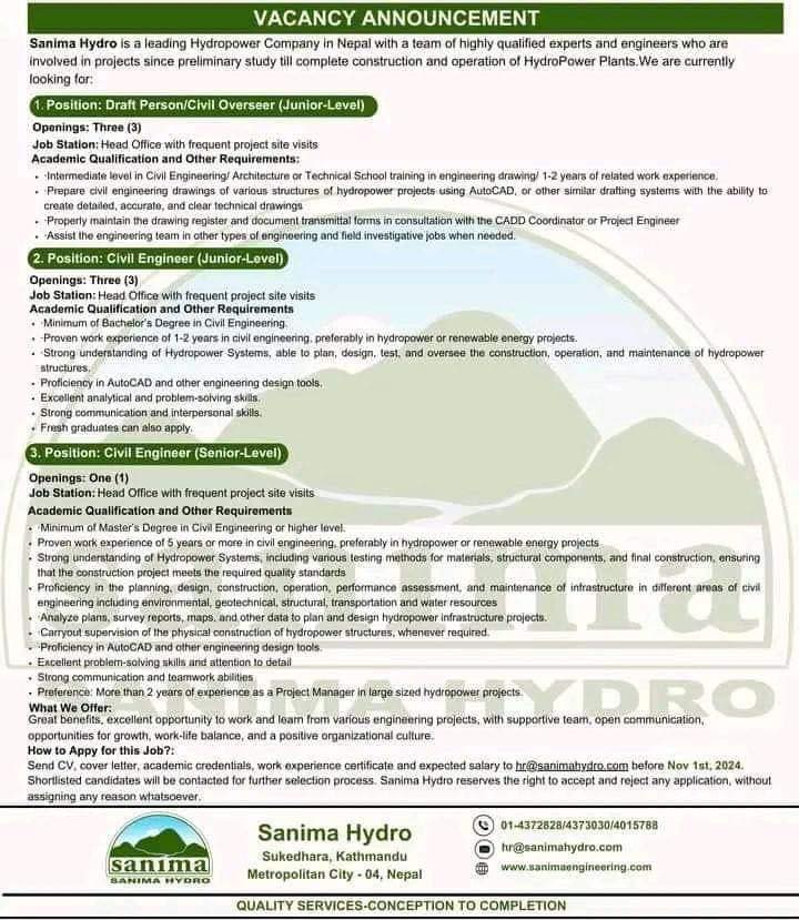 वरिष्ठ सिभिल इन्जिनियरको लागि स्नातकोत्तर डिग्री र ५ वर्षको अनुभव चाहिने कम्पनीले जनाएको छ । इच्छुक तथा योग्यता पुगेकाले व्यक्तिहरूले कात्तिक २४ गते भित्र आवेदन दिनुपर्नेछ ।