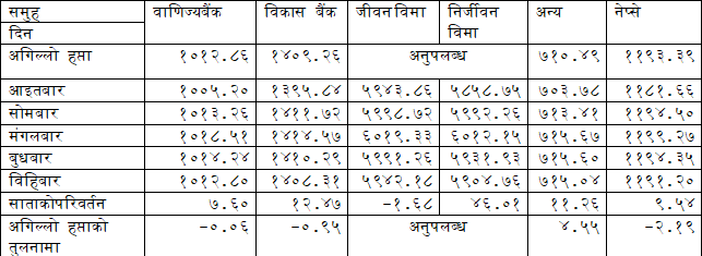 समुहगत परिसूचकमा वाणिज्य बैंक समुहको परिसूचक अगिल्लोहप्ताकोतुलनामापहिलो दिनघटेर दोश्रो, तेस्रो दिन बढेरचौथो र पाँचौ दिन घटेर बन्द भएको छ। पहिलो दिनको तुलनामा अन्तिम दिन७ दसमलव ६० अंकले बढेर बन्द भए पनि अगिल्लो हप्ताको तुलनामा झिनो अंकले घटेको छ। गत हप्ताबाट विमा जीवन र निर्जीवन समुहमा बाँडीएकोले यसको लागि समुहगत तथ्यांक यो हप्ता उपलब्च हुन सकेन। निर्जीवन समुहको सूचक बढेको छ भने जीवन समुह घटेको छ। नेप्सेले सूचिकृत कम्पनीलाई बिभिन्न ११ समुहमा वर्गीकरण गरेको छ। यी समुह मध्ये यस साता पहिलो दिनको तुलनामा वित्त, उत्पादनरजीवन विमा समुहको परिसूचक घटेका छन् भने अन्य सबै समुह बढेका छन्।