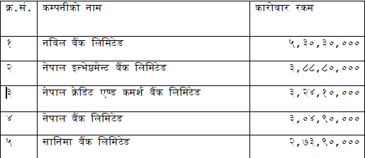 यस हप्ता नबिल बैंक लिमिटेड ५ करोड ३० लाख ३० हजार रकमसहित पहिलो भएको छ। त्यस्तै मेगा बैंक १ लाख ३७ हजार कित्ता शेयर र राइरांग हाइड्रोपावर ७ सय ४५ वटा कारोबार सहित पहिलो भएका छन। रकमको आधारमा पाँच कम्पनी तालिकामा देखाइएको छ।