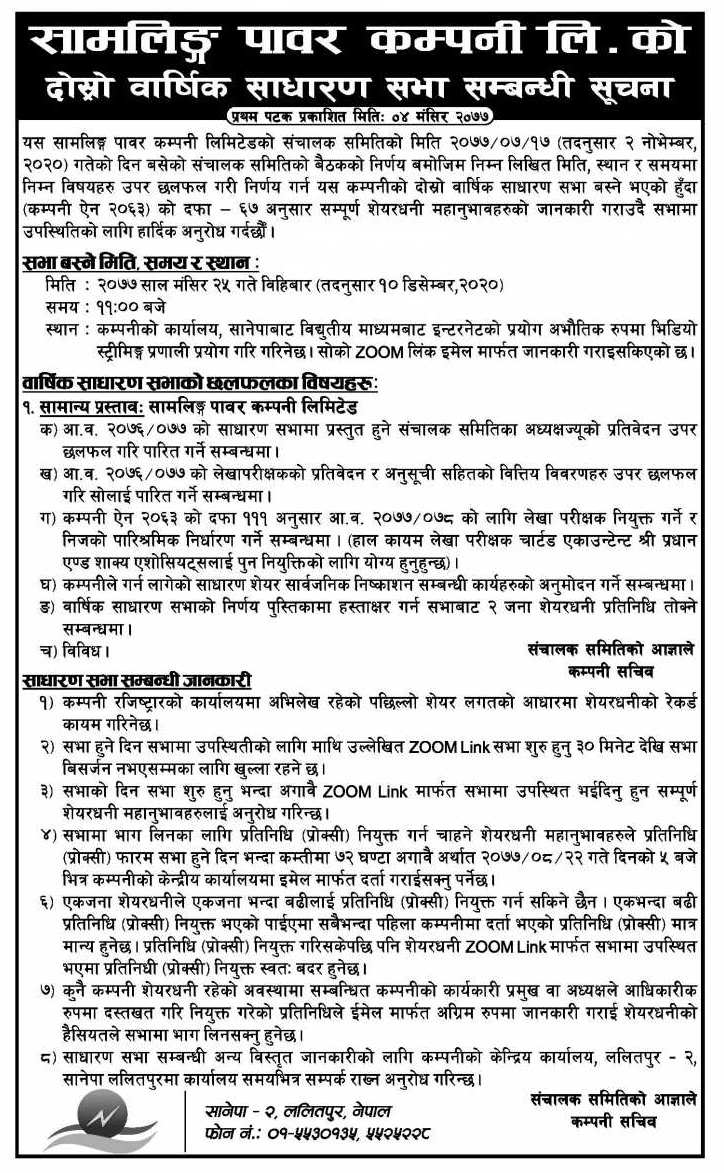 काठमाडौँ । सामलिङ्ग पावर कम्पनी लिमिटेडले वार्षिक साधारण सभा आह्वान गरेको छ । कम्पनीको कार्तिक १७ गते सोमबार बसेको सञ्चालक समितिको बैठकले गरेको निर्णय अनुसार कम्पनीको दोश्रो वार्षिक साधारण सभा मंसिर २५ गते बिहीबार गर्ने जनाएको छ ।