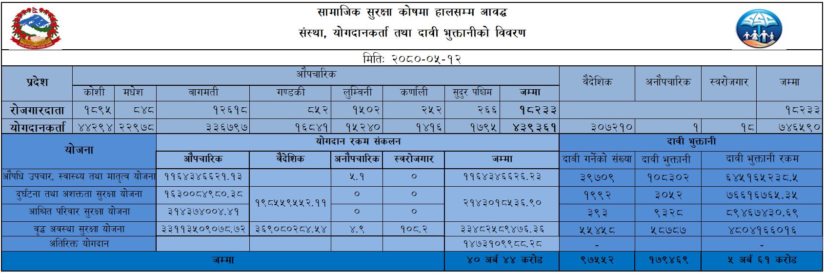 काेषबाट वृद्धाअवस्था सुरक्षा याेजनाबाट ४ अर्ब ८० कराेड रुपैयाँ भुक्तानी गरिएकाे काेषले सार्वजनिक गरेकाे तथ्यांकमा उल्लेख छ । काेषले संकलन गरेकाे याेगदानवापतकाे रकम कूल ४० अर्ब ४४ कराेड रूपैयाँकाे तुलनामा दाबी भुक्तानी गरिएकाे रकम १३.८७ प्रतिशत हाे ।