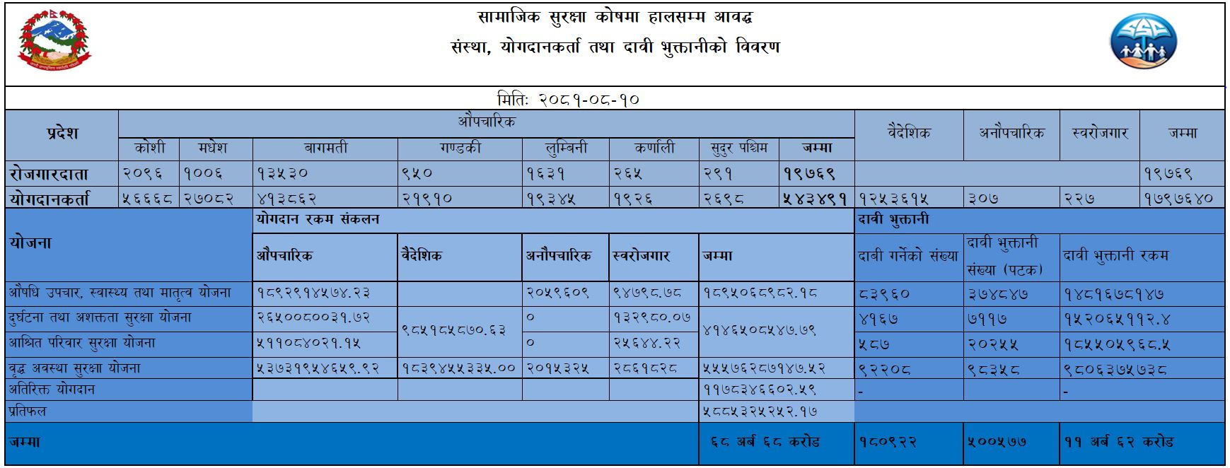 कोषका अनुसार औपचारिकतर्फ ५ लाख ४३ हजार ४९१ जना योगदानकर्ता आबद्ध भएका छन्। वैदेशिक रोजगारीतर्फ १२ लाख ५३ हजार ६१५, अनौपचारिक क्षेत्रका ३०७ र स्वरोजगार क्षेत्रका २२७ जना योगदानकर्ता आबद्ध भएको तथ्यांकले देखाउँछ।