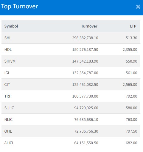 आज २७६ कम्पनीको ८० लाख ८ हजार २४६ कित्ता शेयर किनबेच हुँदा ३ अर्ब ४४ करोड ४८ लाख रुपैयाँको शेयर कारोबार भएको छ । आज सबैभन्दा धेरै सोल्टी होटलको शेयर कारोबार भएको छ । आज कम्पनीको २९ करोड ६३ लाख रुपैयाँको शेयर कारोबार भएको छ । हिमालयन डिष्टिलरीको १५ करोड २ लाख रुपैयाँको शेयर कारोबार भएको छ । शिवम् सिमेन्टको १४ करोड ७५ लाख रुपैयाँको शेयर कारोबार भएको छ ।