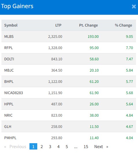 आज सबैभन्दा धेरै मानुषि लघुवित्त वित्तीय संस्थाका लगानीकर्ताले कमाएका छन् । आज यस कम्पनीका लगानीकर्ताले ९ दशलमव ०५ प्रतिशतका दरले कमाएका हुन् । रिभर फल्स पावर र दोल्ती पावरका लगानीकर्ताले ७ प्रतिशतका दरले कमाएका छन् । मध्य भोटेकोशीका लगानकिर्ताले ५ दशलमव ८४ प्रतिशतका दरले कमाएका छन् ।