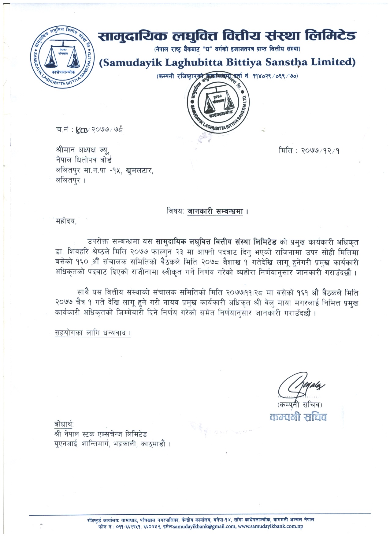 कम्पनीको फागुन २८ गते बसेको सञ्चालक समितिको बैठकले कम्पनीका नायव प्रमुख कार्यकारी अधिकृत वेलु माया मगरलाई निमित्त प्रमुख कार्यकारी अधिकृतको जिम्मेवारी दिने निर्णय गरेको एक सुचना जारी गर्दै संस्थाले जनाएको छ ।