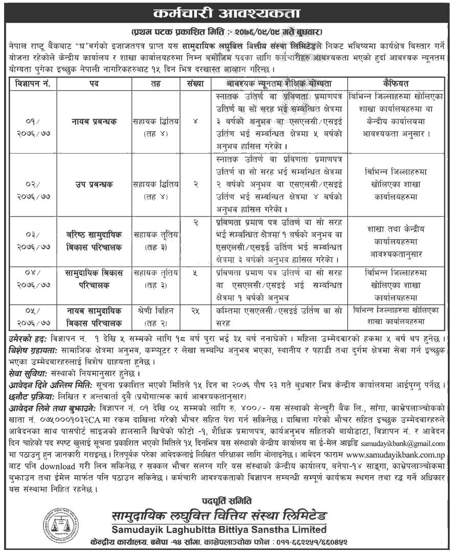 नायब प्रबन्धक पदका लागि ४ जना, उप प्रबन्धक पदका लागि २ जना, वरिष्ठ सामुदायिक विकास परिचालक पदका लागि २ जना, सामुदायिक विकास परिचालक पदका लागि ५ जना र नायब सामुदायिक विकास परिचालक पदका लागि २५ जना कर्मचारी माग गरेको जनाएको छ ।