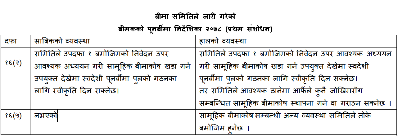 काठमाण्डौं । बीमा कम्पनीहरुले पूनर्बीमा सम्झौता सम्भव नहुने जोखिम बहनका लागी स्थापना गर्ने सामूहिक बीमाकोष बीमा समितिले पूर्णरुपमा आफ्नो नियन्त्रणमा ल्याउने तयारी शुरु गरेको छ । समितिले यसअघि बीमकहरुको अनुरोधमा सामूहिक बीमा कोष वा बीमा पुल स्थापनाको स्वीकृति दिने प्रावधान रहेकोमा पूनर्बीमा सम्बन्धि निर्देशिका २०७८ को पहिलो संशोधनमा समिति स्वयम्ले पनि सामूहिक बीमाकोष स्थापना गर्न वा गराउन सक्ने प्रावधान थप गरिएको छ ।
