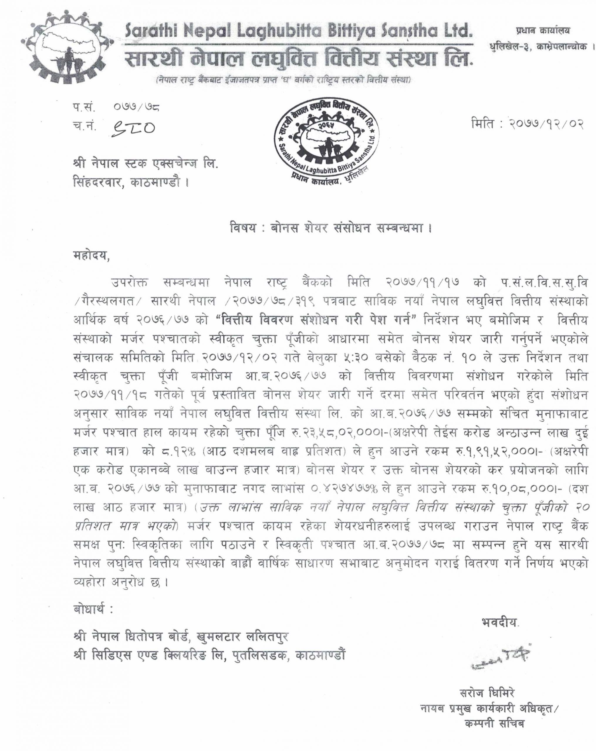 काठमाडौं । सारथी नेपाल लघुवित्त वित्तीय संस्थाको बोनश शेयर संशोधन भएको छ । नेपाल राष्ट्र बैंकले साविक नयाँ नेपाल लघुवित्त वित्तीय संस्थाको आर्थिक वर्ष २०७६/७७ को वित्तीय विवरण संशोधन गरी पेश गर्न निर्देशन दिएकाले बोनश शेयर परिवर्तन भएको संस्थाले एक सुचना जारी गर्दै जनाएको छ ।
