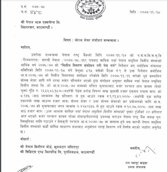 यस अघि संस्थाले चुक्ता पुँजीको ९ दशमलव ११ प्रतिशतले हुन आउने २ करोड १४ लाख ४४ हजार ३ सय ५० रुपैयाँ बराबरको बोनस शेयर र कर प्रयोजनको लागि ० दशमलव ४७९४ प्रतिशतले हुन आउने ११ लाख २८ हजार ६ सय ५० रुपैयाँ नगद लाभांश गरि कुल ९ दशमलव ५८९४ प्रतिशत लाभांश वितरण गर्ने प्रस्ताव गरेको थियो ।