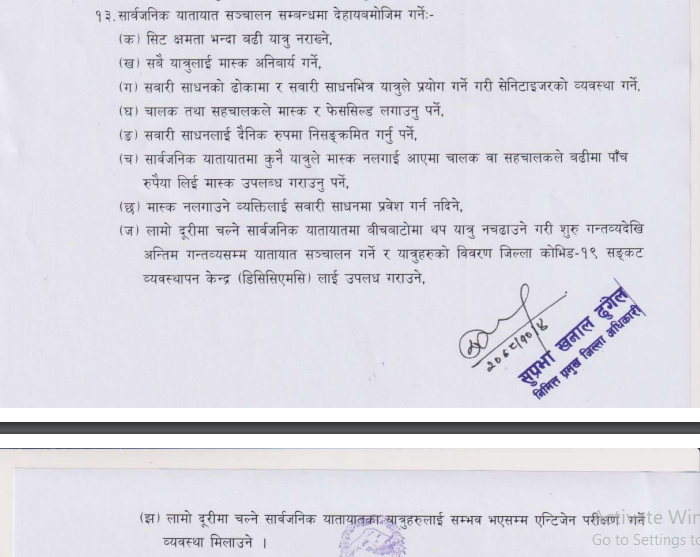 सार्वजनिक यातायातमा कुनै यात्रुले मास्क नलगाई आएमा चालक वा सहचालकले बढीमा पाँच रुपैयाँ लिई मास्क उपलब्ध गराउनु पर्ने भएको छ । मास्क नलगाउने व्यक्तिलाई सवारी साधनमा प्रवेश गर्न नदिनेसम्मको व्यवस्था गरिएको छ । लामो दूरीमा चल्ने सार्वजनिक यातायातमा बीचबाटोमा थप यात्रु नचढाउने गरी शुरु गन्तव्यदेखी अन्तिम गन्तव्यसम्म यातायात सञ्चालन गर्ने र यात्रुहरुको विवरण जिल्ला कोभिड १९ सङ्कट व्यवस्थापन केन्द्रलाई उपलब्ध गराउनु पर्नेछ ।