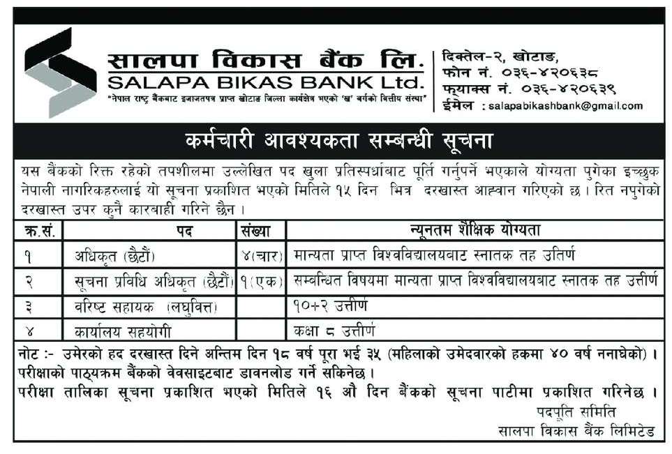 काठमाडौँ । सालपा विकास बैंक लिमिटेडले विभिन्न पदका लागि कर्मचारी माग गरेको छ । बैंकले अधिकृत, सूचना प्रविधि अधिकृत, वरिष्ठ सहायक र कार्यालय सहयोगी र बाइक राइडर पदका लागि कर्मचारी माग गरेको जनाएको छ ।