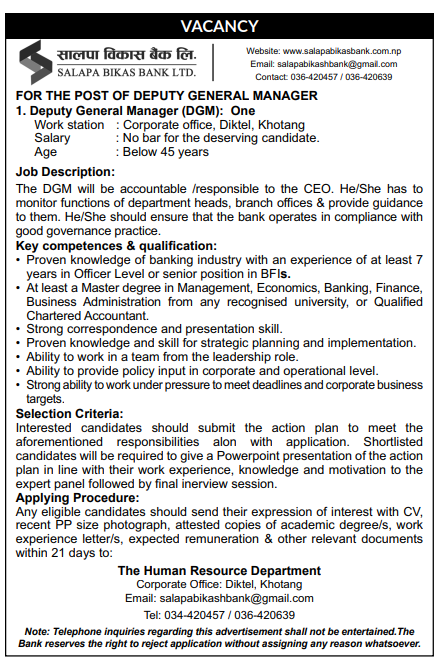 काठमाडौं । सालपा विकास बैंकले डेपुटि जनरल म्यानेजर(डिजिएम) का लागि १ जना कर्मचारीको माग गरेको छ । कम्पनीले उक्त पदका लागि ४५ वर्षभन्दा मुनीको हुनुपर्ने, सात वर्ष अफिसर लेभल वा सिनियर पोजिसनमा काम गरेको अनुभव हुनुपर्ने जनाएको छ । कर्पोरेट अफिसर दिक्तेल खोटाङका लागि डिजिएम माग गरेको जनाएको छ । ईच्छुक तथा योग्यता पुगेकाले सुचना प्रकाशित भएको मितिले २१ दिनभित्र आवेदन दिनुपर्नेछ ।
