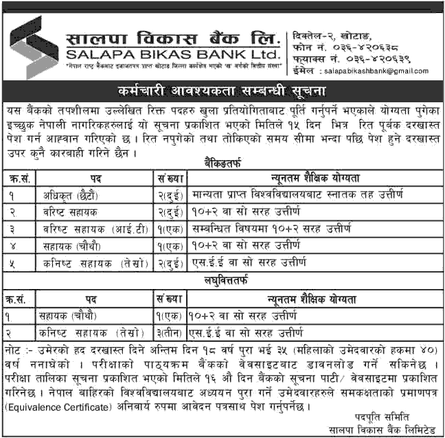 काठमाडौं । सालपा विकास बैंकले विभिन्न पदका लागि कर्मचारीको माग गरेको छ । बैंकले अधिकृतका लागि २ जना, वरिष्ठ सहायकका लागि २ जना, वरिष्ठ सहायक आइटीका लागि १ जना, सहायकका लागि १ जना, कनिष्ठ सहायकका लागि २ जना, सहायक चौथो पदका लागि १ जना र कनिष्ठ सहायक तेस्रोका लागि ३ जना कर्मचारीको माग गरेको छ ।