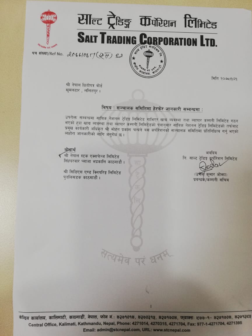काठमाडौं । साल्ट ट्रेडिङ कर्पोरेशन लिमिटेडमा सञ्चालक हेरफेर भएका छन् । साविक नेशनल ट्रेडिङ लिमिटेडको तर्फबाट प्रमुख कार्यकारी अधिकृत(सीईओ) मोहन प्रकाश चन्दले कर्पोरेशनको सञ्चालक समितिमा प्रतिनिधित्व गरेको कम्पनीले जनाएको छ ।