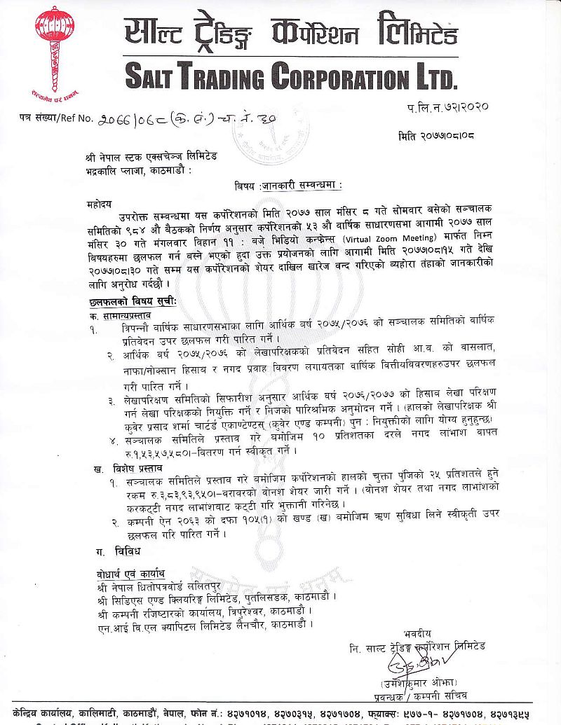 काठमाडौं । साल्ट ट्रेडिङ कर्पोरेशन लिमिटेडको वार्षिक साधारणसभा आज हुने भएको छ । कम्पनीको ५३ औं वार्षिक साधारणभा २०७७ मंसिर ३० गते, बैंकको प्रधान रजिष्टर्ड कार्यालय, काठमाडौंमा विहान ११ः०० बजे हुने जनाएको छ । सभा वेविनार मार्फत संचालन गरिने समेत कम्पनीले बताएको छ ।