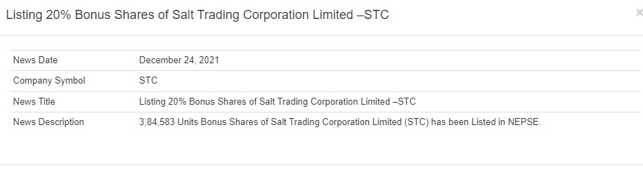 काठमाडौं । साल्ट ट्रेडिङ कर्पोरेशन लिमिटेडको बोनश शेयर नेपाल स्टक एक्सचेञ्जमा सूचिकृत भएको छ । कम्पनीको ३ लाख ८४ हजार ५८३ कित्ता बोनस शेयर सूचिकृत भएको हो ।