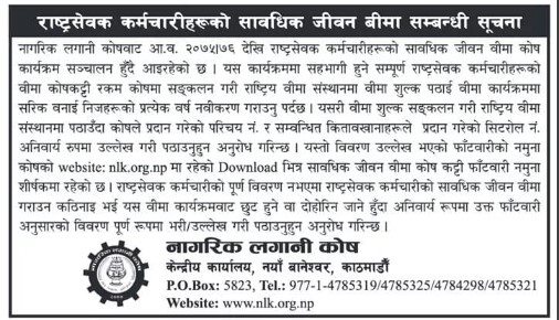 काठमाडौं । नागरिक लगानी कोषले सबै राष्ट्र सेवक कर्मचारीहरुलाई सावधिक जीवन बीमाको लागि सही विवरण भरेर पठाउन आग्रह गरेको छ । कोषले आज एक सूचना जारी गर्दै भनेको छ, ‘नागरिक लगानी कोषबाट आव २०७५।०७६ देखि राष्ट्र सेवक कर्मचारीहरुको सावधिक जीवन बीमा कोष कार्यक्रम सञ्चालन हुँदै आएको छ । यस कार्यक्रममा सहभागी हुने सम्पूर्ण राष्ट्र सेवक कर्मचारीहरुको बीमा कोषकट्टी रकम कोषमा संकलन गरी राष्ट्रिय बीमा संस्थानमा बीमा शुल्क पठाई बीमा कार्यक्रममा सरिक बनाई निजहरुको प्रत्येक वर्ष नविकरण गराउनु पर्दछु ।’